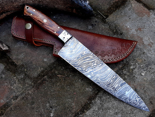 HTK-207 Damascus knife Custom Hand Made / Olive Wood handle / Damascus steel bolster / Liner Lock